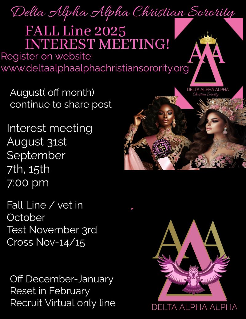 Here you will find information concerning our Sorority ,our Purpose, Mission Vision, Objective.. We hope that you see yourself being part of this Kingdom Move of God . Here , with Delta Alpha Alpha Christian Sorority we don't compete but we complete the assignment together.. Our sisterhood is a place for women form all walks of Life. Feel free to browse through the various areas of our website and learn about our Sisterhood.